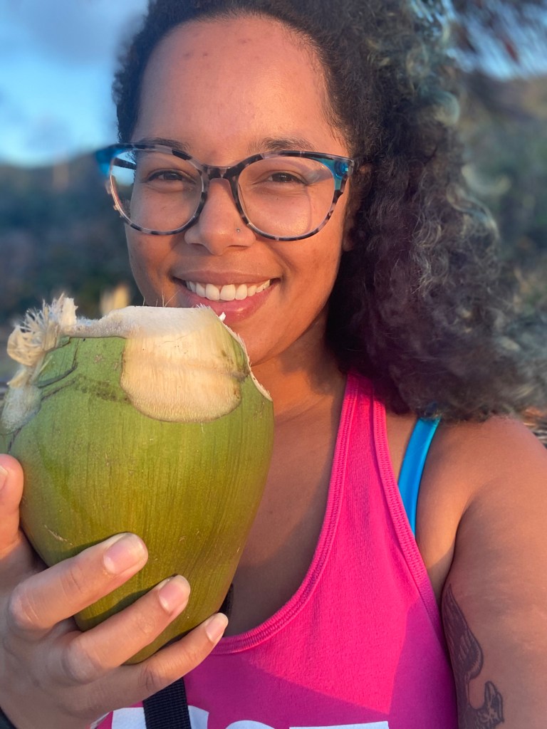 That was a bit of a tangent… anyway, we head off towards the rainforest. We go up the winding roads that have more potholes than I can count, and we make it slowly to this fork in the road. To the right, this abandoned building that is surrounded by trees so much so that it legit looks like a scene from Jurassic Park (Lost World), but is next to the entrance to a hiking trail that leads to a lighthouse at the top of this mountain. To the left, the way we decided to go, we are led to a beach. This is not a traditional beach in the sense of nice soft sand. No, this beach is just a ton of eroded rock and some palm trees to the side. Well, Matt brought his machete, so he got us a couple coconuts and opened those bad boys up!