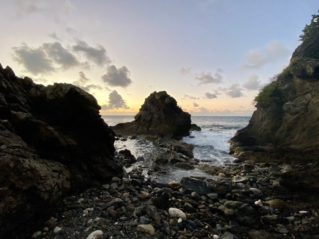 So, once we got our coconuts and proceeded to walk north along the coastline. This place was incredible. The waves were crashing like crazy, you can see all the tidepools with animals in them (I saw a sculpin!), and it was the start to a beautiful evening. Matt told me this wasn’t even his favorite part yet. He turns and says to me, “How do you feel about climbing?” I’m in my head thinking I’m about to have to climb and scale the side of a cliff and I start freaking out a bit. But, I remember that he had done this before so I said, “well, if you could do it alone, I’m sure I can handle it.” So we started walking along the rock beach. By the way, this beach looks like what we think the surface of Mars looks like, no joke. It’s got a reddish tint, it’s rocky, and has little holes in places. It just overall looks like you’re on another planet. Plus, I now have a prime location to get me some succulents because they were all over the ground!